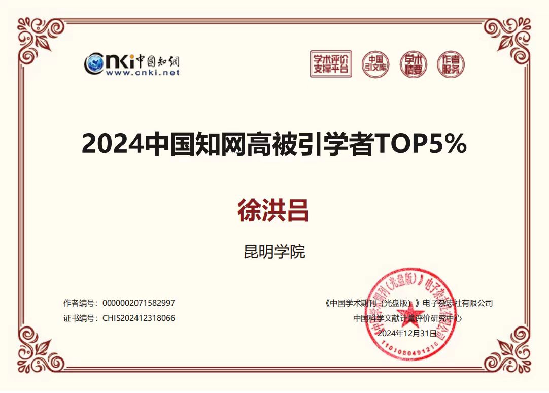 2026年世界杯官网教师徐洪吕博士入选2024中国知网高被引学者TOP5%