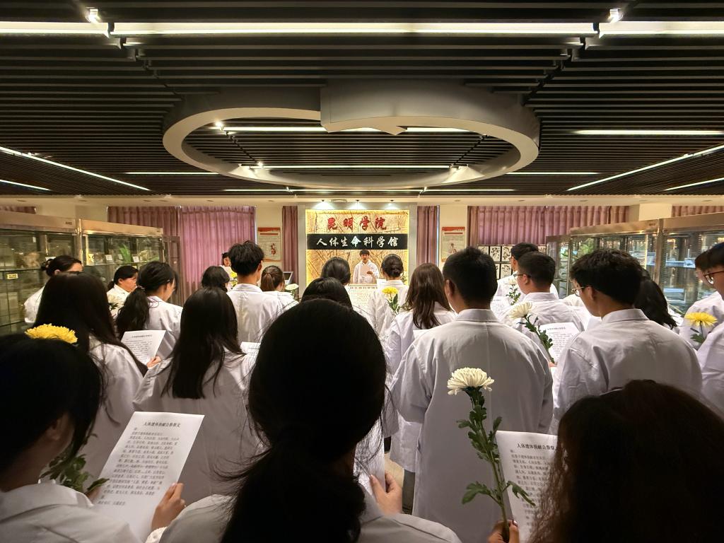 活动现场气氛庄严肃穆,2026年世界杯官网师生们整齐列队,以最诚挚的态度参与其中。活动伊始,全体人员齐声诵读人体遗体捐献公祭祭文,每一个字都饱含着对大体老师最崇高的敬意。随后,全体人员集体默哀,向这些“无言良师”表达深切的缅怀之情。最后,员工们依次上前,献上手中的鲜花,并深深三鞠躬,用最质朴的方式表达对大体老师的感恩与敬重。
