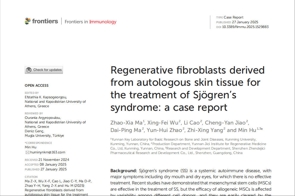 云南省骨与关节疾病基础研究重点实验室近期取得科研进展,其自主研发的自体皮肤源修复型成纤维细胞(rFib)技术成功治愈一名难治性干燥综合征患者。该案例研究于2025年1月27日发表于国际期刊《Frontiers in Immunology》,为全球400万干燥综合征患者带来新希望。