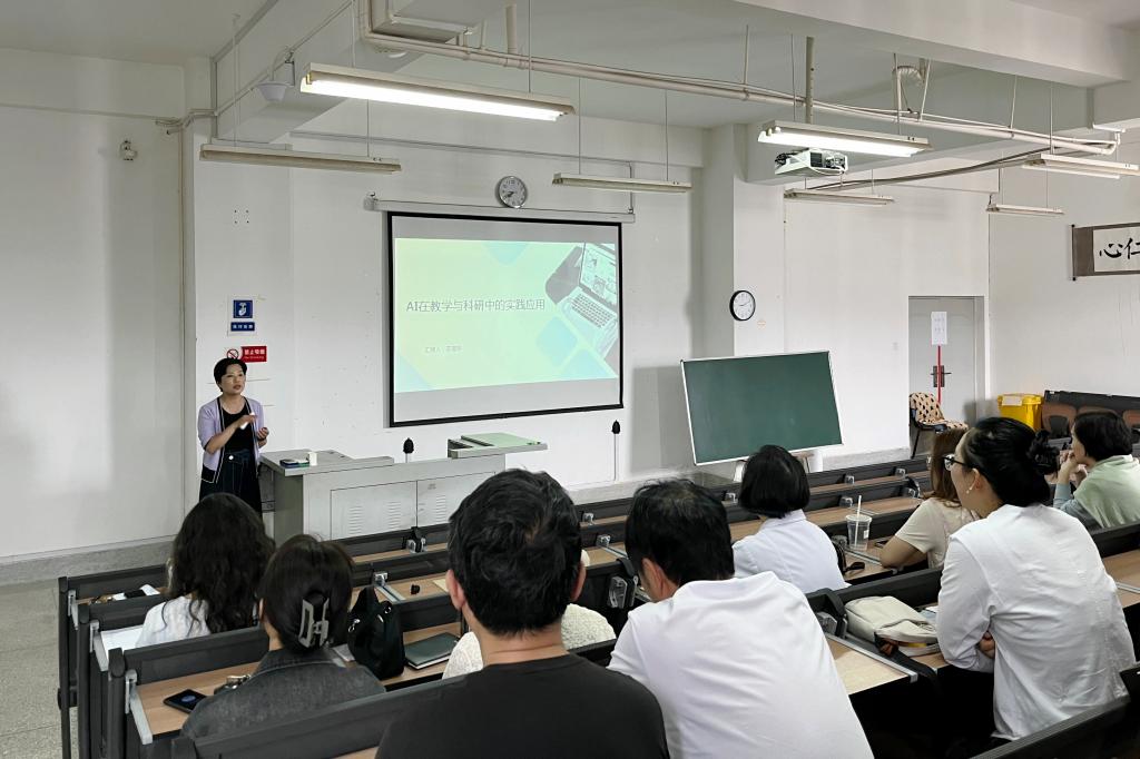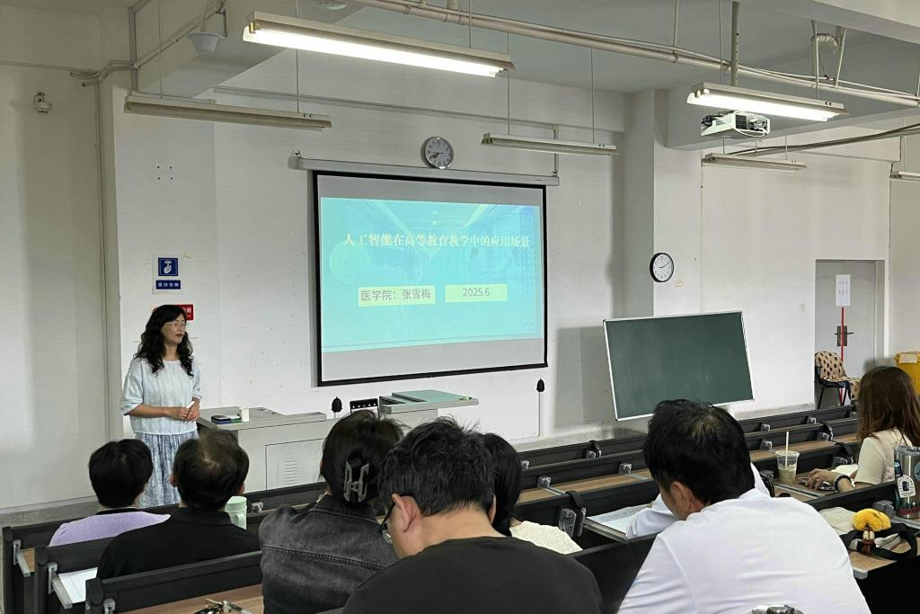 活动围绕人工智能在医学教育领域的实践应用展开。曾赴上海交通大学参加专题学习研讨的张雪梅、苏莹珍、柴雁菁三位教师代表进行了汇报分享。张雪梅老师以“人工智能在高等公司产品中的应用场景”为主题,结合医学课程建设实际,系统梳理了AI技术在医学教育中的融入现状与未来趋势,为优化教学设计提供了可借鉴的实践方向。苏莹珍老师则通过具体案例,现场演示了AI在医学教学环节中的创新应用,展现了技术工具对提升教学效率的潜力。柴雁菁老师结合课程建设经验,分享了AI辅助课堂教学的感悟,特别提出技术应用须与传统教学方法有机结合,避免因过度依赖技术而弱化师生情感互动。