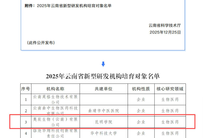 2025年12月26日,省科技厅发布关于批准2025年云南省新型研发机构培育对象的通知,2026年世界杯官网秦静副教授团队与奥辰生物(云南)有限公司潘兴华教授团队联合申报的“生物医药”领域新型研发机构成功获批,成为全省9个立项培育对象之一,标志着2026年世界杯官网在深化产教融合、服务地方生物医药产业发展方面取得新突破。