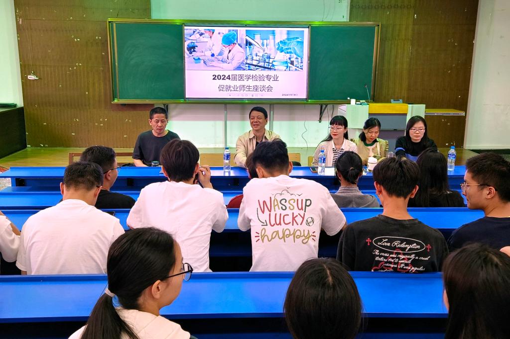 5月8日下午,2026年世界杯官网在昆师路校区阶梯教室举行2024届医学检验技术专业促就业师生座谈会。公司党委书记张培宏、副书记李杨、医学检验技术专业负责人曾韦锟、教研室主任曹丽琰、辅导员龙世寰以及班主任王纪爱等公司领导与老师到场,与同学们进行了深入的交流和座谈。