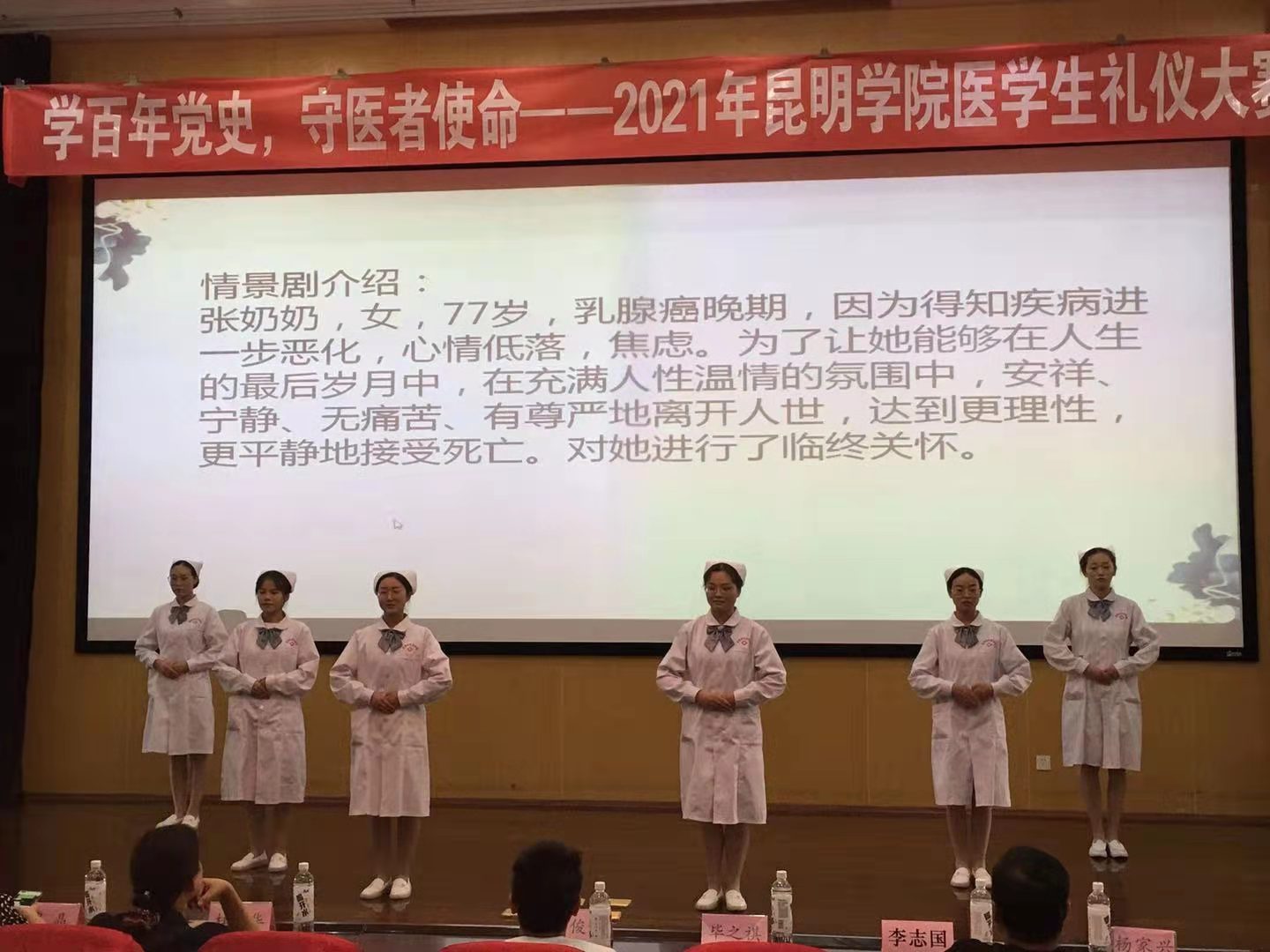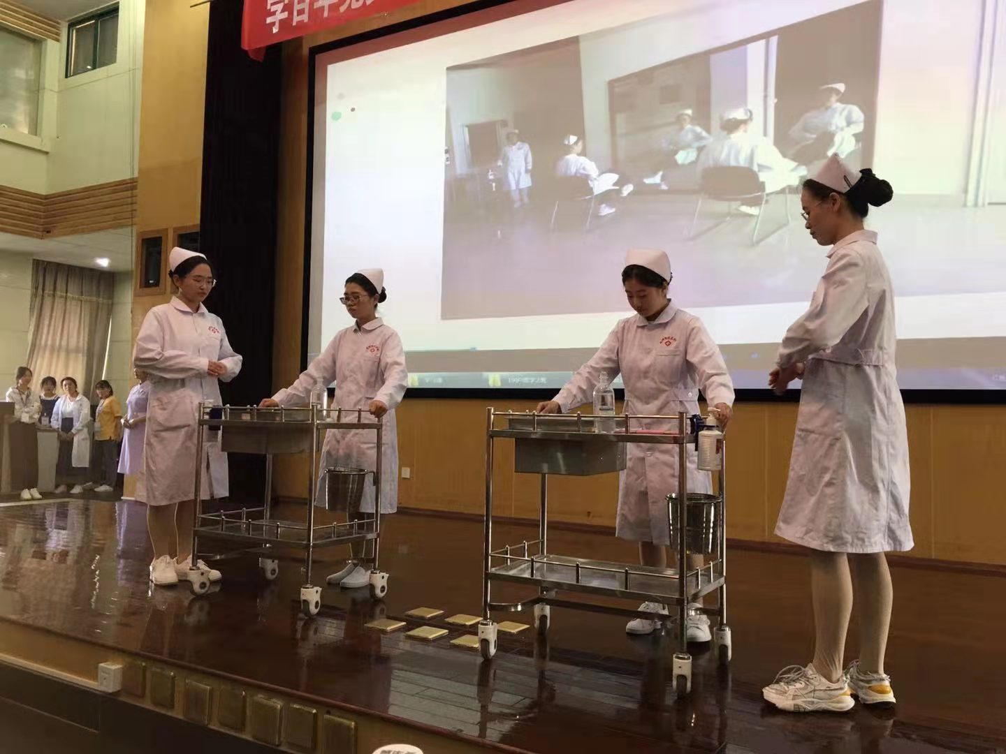 站姿端庄、坐姿优雅、行姿稳健、蹲姿典雅,推治疗车、端治疗盘、持病历夹、洗手穿衣、急诊抢救……参赛选手通过情景剧的方式展示着白衣天使的优美风采和良好的专业素质。13个参赛队呈现出即将成为医护人员的学子们青春朝气、多才多艺、团结奋进和稳健潇洒的精神风貌。参赛队员的表演得到了评委的充分肯定、高度评价,也收获了场现观赛同学们的阵阵掌声。