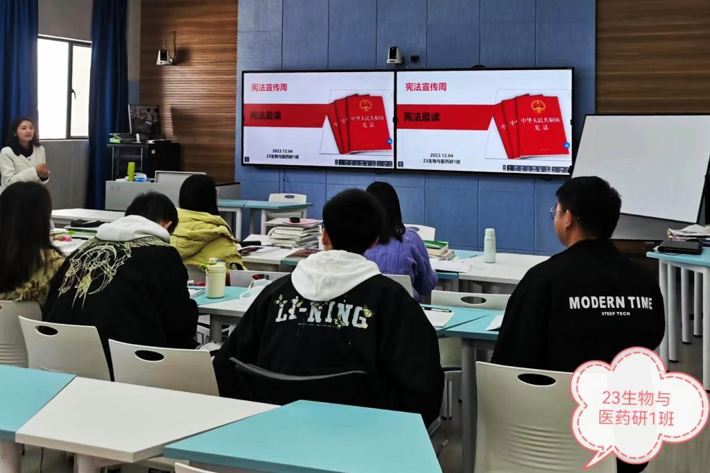 12月4日,全院师生参加了教育系统“宪法晨读”网络直播,同步参加升国旗仪式和“宪法晨读”跟读活动。在医学楼1417会议室,公司领导班子、管理岗位全体职工、辅导员、党支部书记集中参加活动,跟读宪法部分内容,在庄严的仪式氛围中感受宪法权威和精神。各班级根据情况采取用步或课间、课后等方式开展“宪法晨读”和“学宪法讲宪法”主题班会。