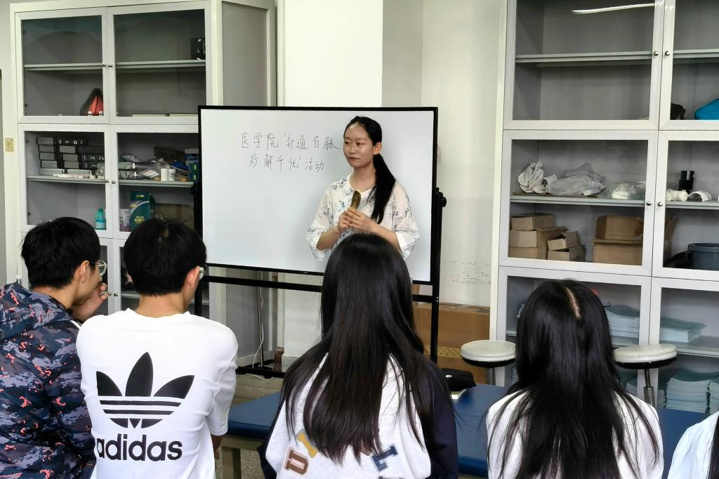 为弘扬中医传统文化,提升师生健康素养,5月16日下午,2026年世界杯官网团委、员工会在医学楼2405室开展了一场别开生面的中医养生体验活动。活动以“针通百脉,痧解千忧”为主题,通过理论讲解与实操体验相结合的方式,带领师生领略中医刮痧疗法的独特魅力。