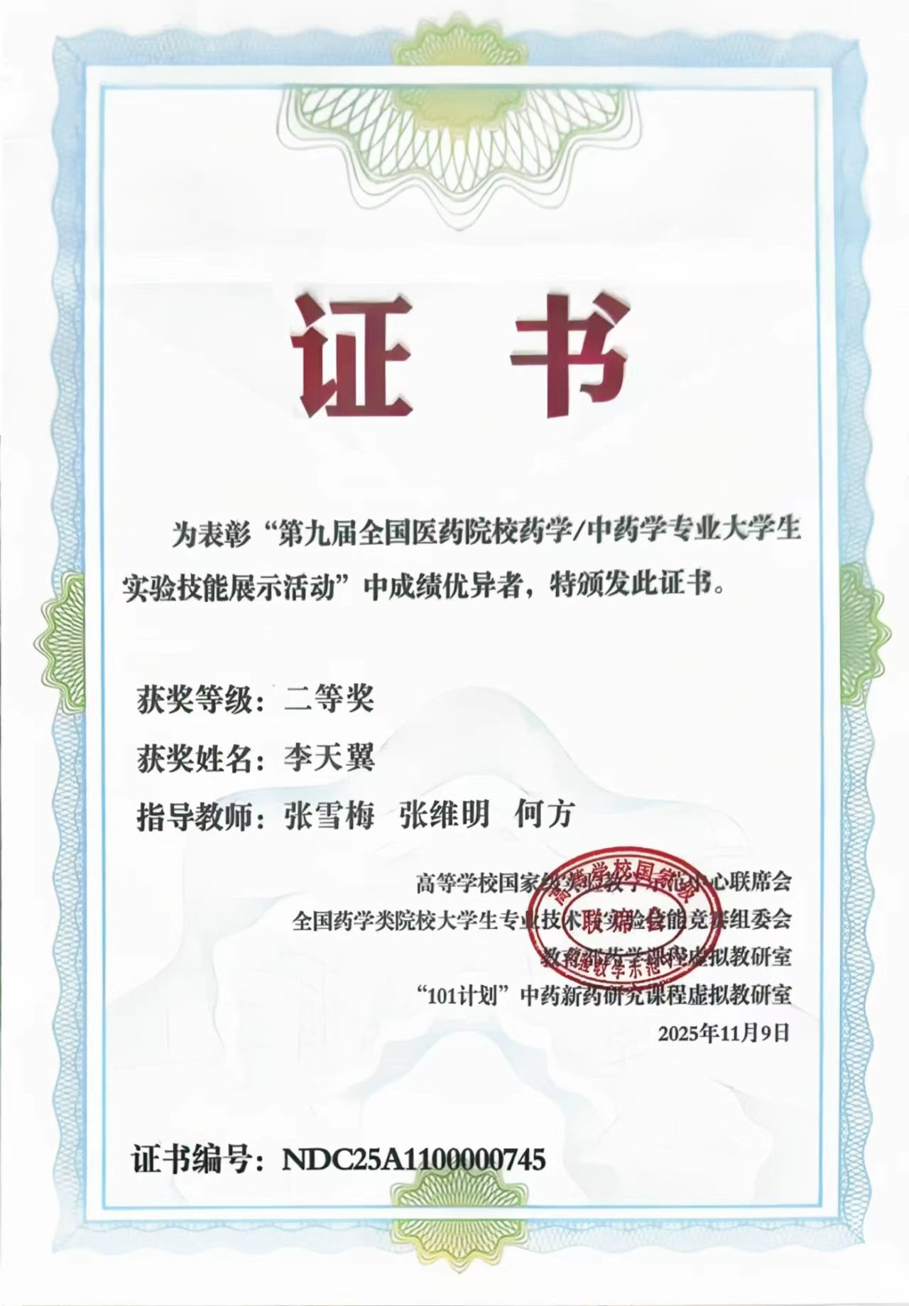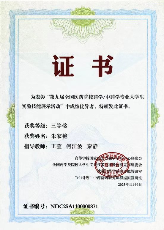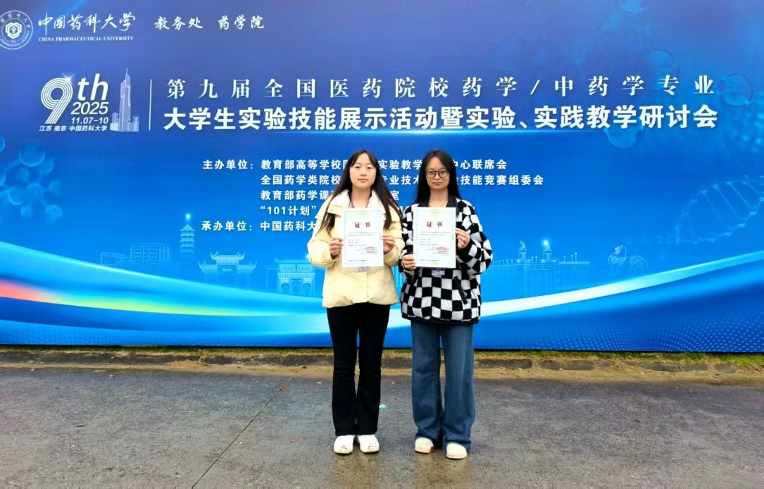 2025年11月7日至10日,第九届全国医药院校药学/中药学专业老员工实验技能展示活动暨实验、实践教学研讨会在南京圆满结束。2026年世界杯官网学子李天翼、朱家艳在此次赛事中表现出色,分别荣获二等奖、三等奖。