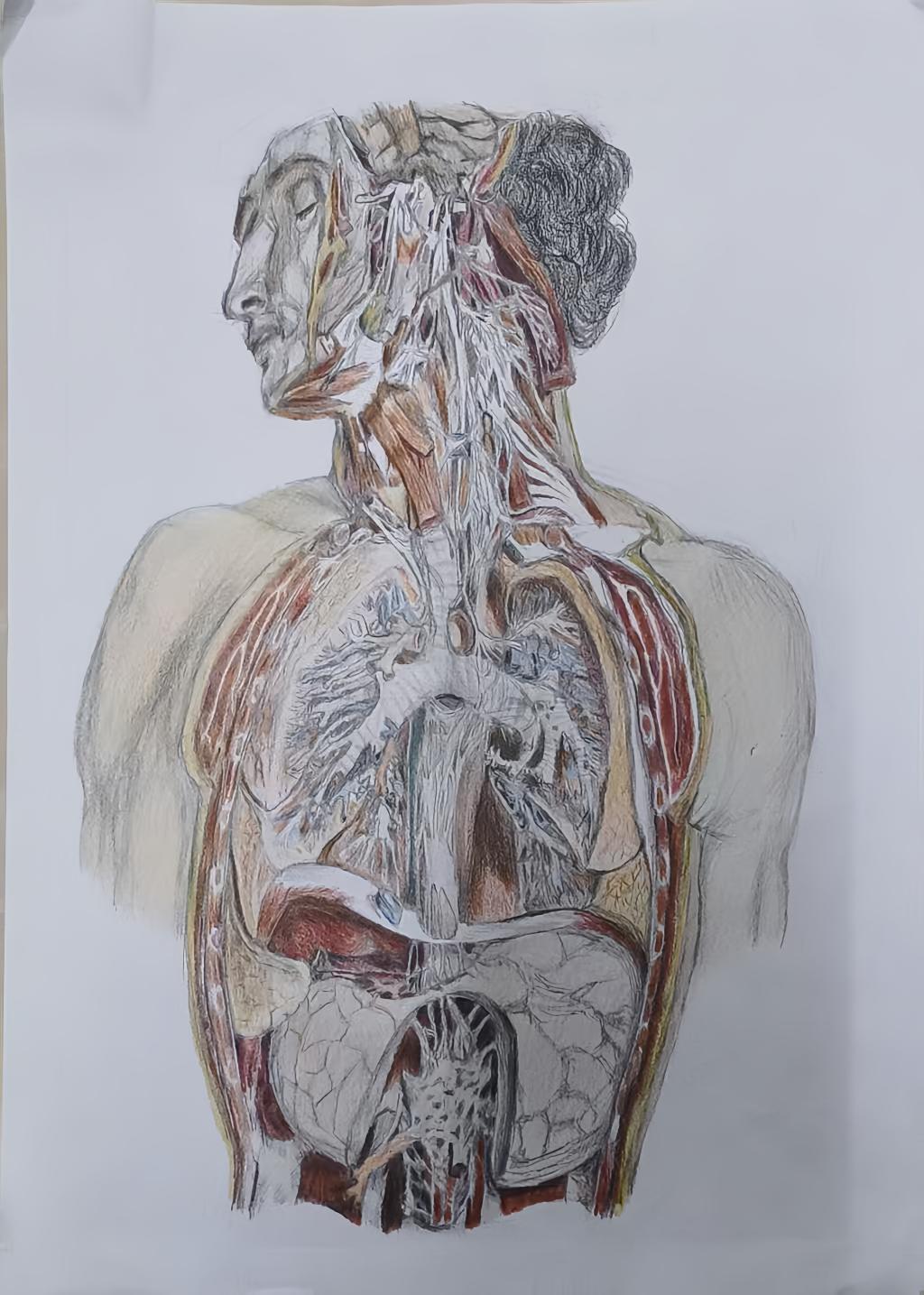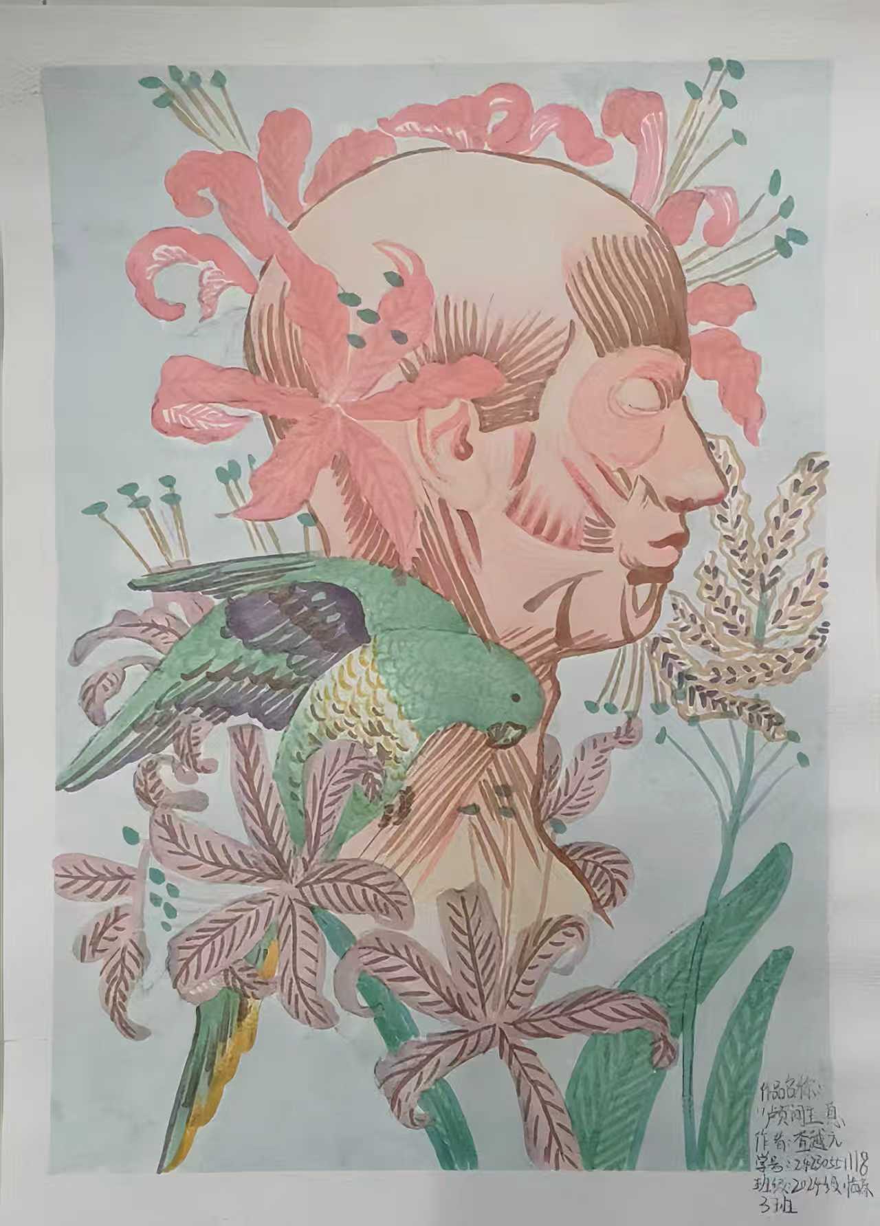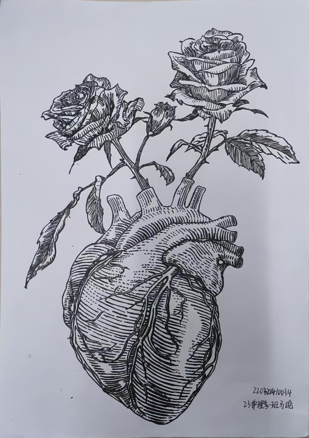 经过由袁德凯、赵树生两位解剖学专任教师及部门负责人组成的评审团公平严谨的评选,多幅优秀作品脱颖而出。24临床1班李青露的《心脏与舞动》荣获一等奖;24医检1班朱墨妍的《颈胸段解剖侧面观》、24临床3班查越云的《颅间生息》、24医检1班张杰的《人体骨架》获得二等奖;23护理1班马晗的《心蕊》、23医检1班吴优的《赤心载春》、24医检1班黄舒雅的《心荷铃》、24临床1班冯欣悦《玫瑰与亡灵的夜曲》、23临床1班刘冰燕的《妄》等五幅作品获得三等奖。