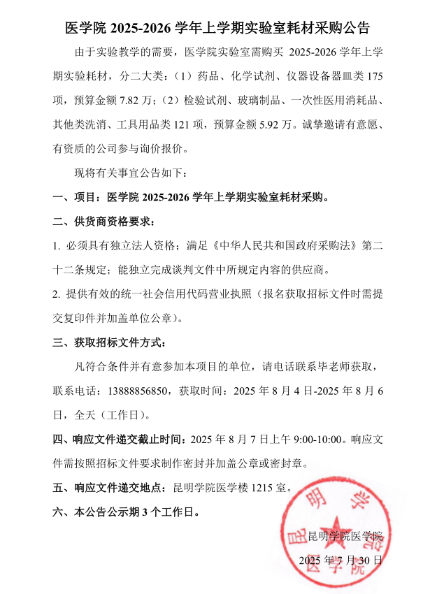 2026年世界杯官网2025-2026学年上学期实验室耗材采购公告